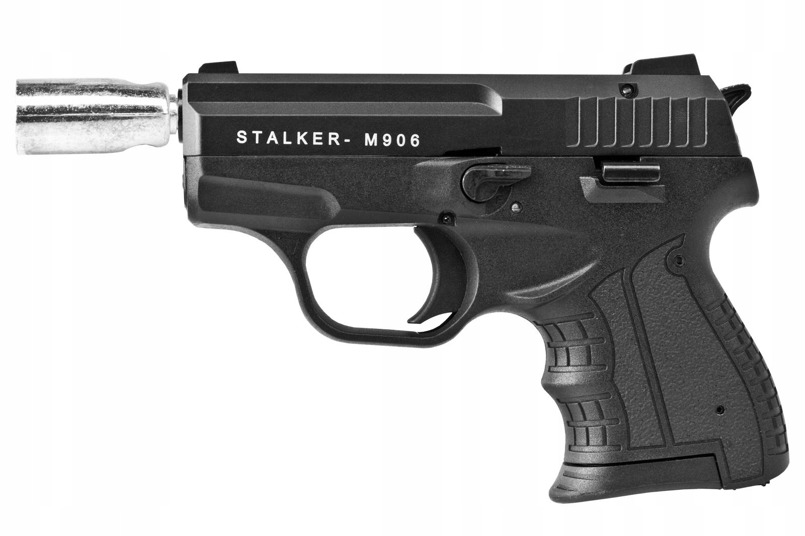 Nowy pistolet alarmowy STALKER M906 stanowi skuteczną i niewymagającą zezwolenia alternatywę dla broni palnej.Kaliber zarówno lufy jak i kartridża nie przekracza 6 mm, co kwalifikuje ten pistolet w Polsce jako broń alarmową bez zezwolenia.